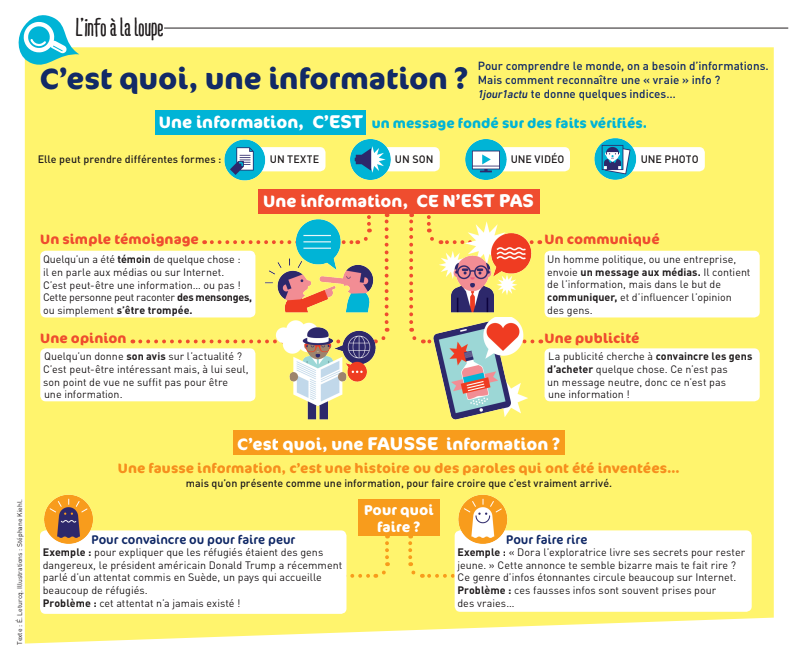 Rumeur, anecdote, opinion, communiqué peuvent souvent être confondus par les élèves avec une information (un fait vérifié qui intéresse un grand nombre de personnes). Cependant, à l’heure où l’information circule de plus en plus vite, les médias diffusent parfois des informations qui ne sont pas sûres.